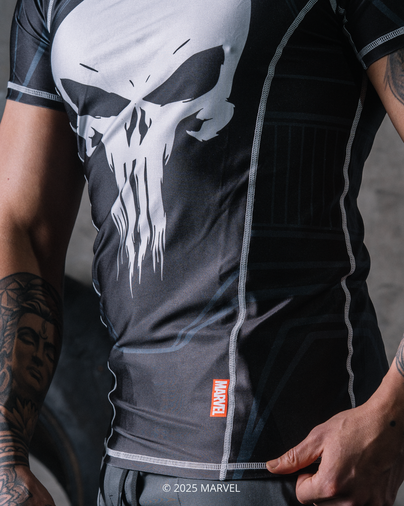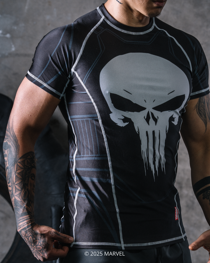 Fit Description: Performance compression fit—snug around the chest, shoulders, and arms with standard torso length for full mobility during grappling and training.