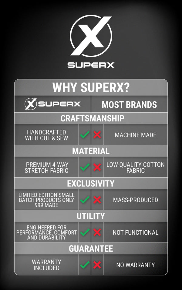 When selecting the fabric for our SuperSuits, we focus on many factors including comfort, flexibility, sweat wicking, breathability, durability and longevity. To achieve this, we use superior fabric blends that are lightyears ahead of what most brands use in their products. Each SuperX product is created with a high end 4-Way Stretch fabric. Some of of these fabrics include Supima French Terry Cotton, Elastane Spandex and more. These premium fabrics are only used by the world's best brands because it is very costly to use. With every SuperX product, you can be sure that your suit will stand strong against whatever life throws at you, lasting 10-15x longer than average athletic wear.
