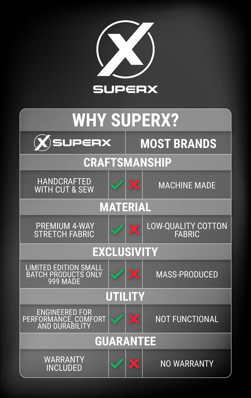 At SuperX, every design is created following 3 frameworks: taking inspiration from your favorite character, is adaptable for wear inside or outside of the gym and accentuates your physique to appear more muscular. When creating inspiration for each character, we spend months analyzing hundreds of movies, comics and images to ensure character accuracy. Next, we ask "how can this design be adaptable to a variety of environments? Ranging from the gym to the streets?" and lastly, we organize design features to accentuate key muscles like your chest, shoulders, back and arms. Following these 3 design principles results in a product that is truly remarkable, standing apart from all other activewear in the world.